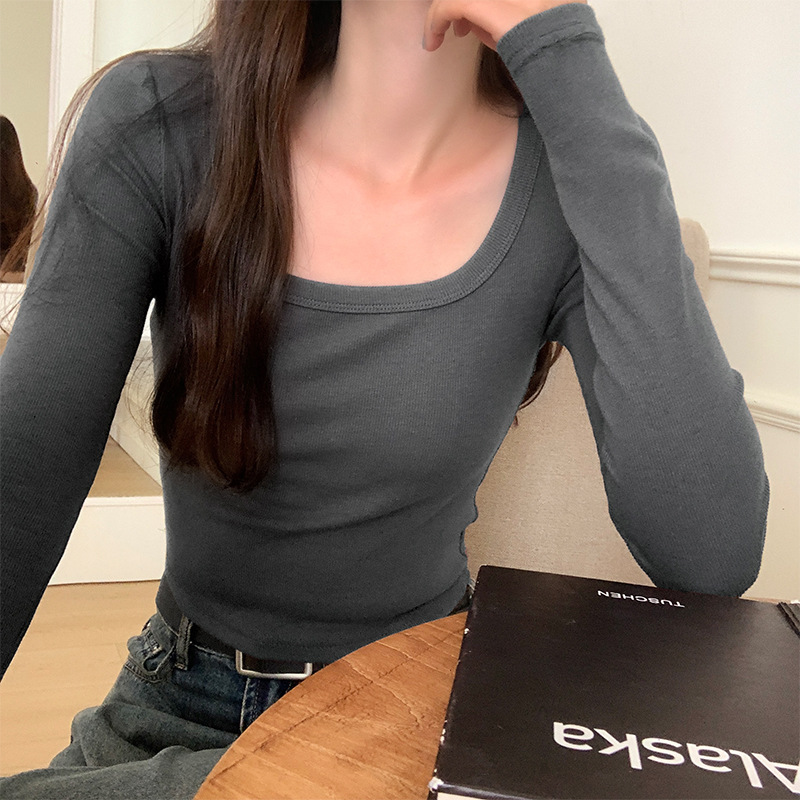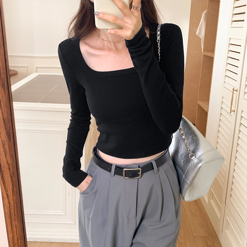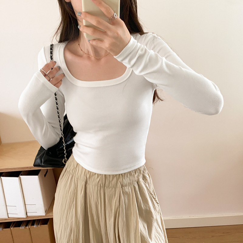 Toloer Color Straight Shoulder Slim Square Collar Threaded Short-Sleeved T-Shirt Early Autumn All Look Thin Undershirt-Outfit Ideas