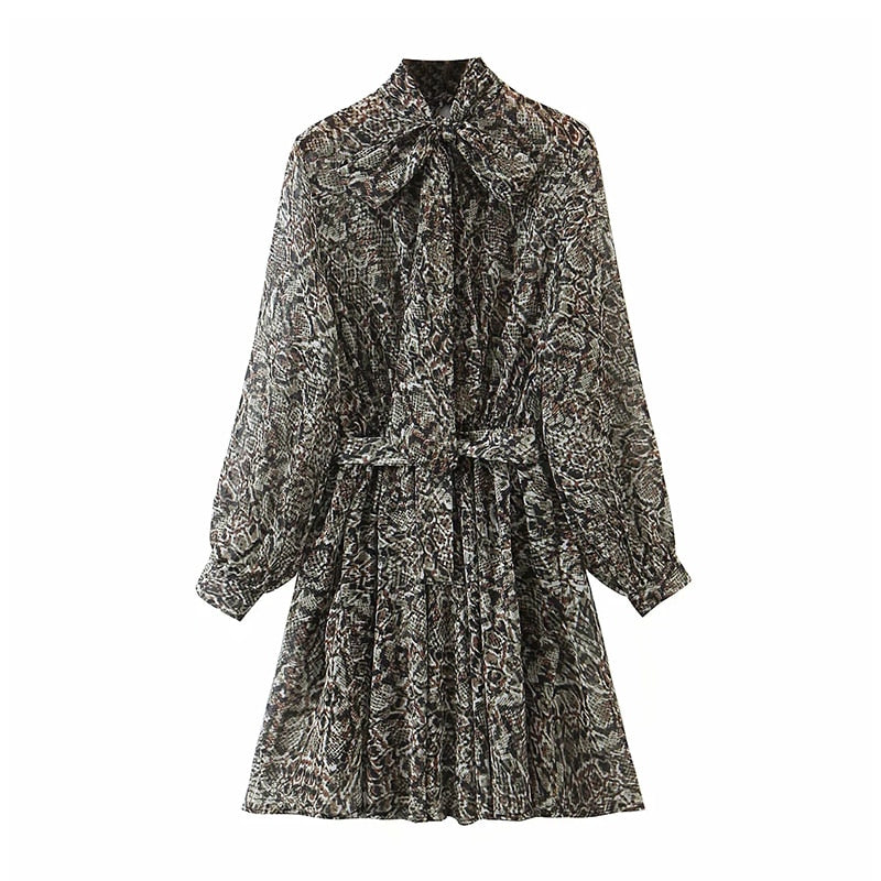 Aachoae 2021 Fashion Women Snake Print Dress Bow Tie Neck Streetwear Mini Chiffon Dress Bandage Pleated Sundress Femme Robe S-XL