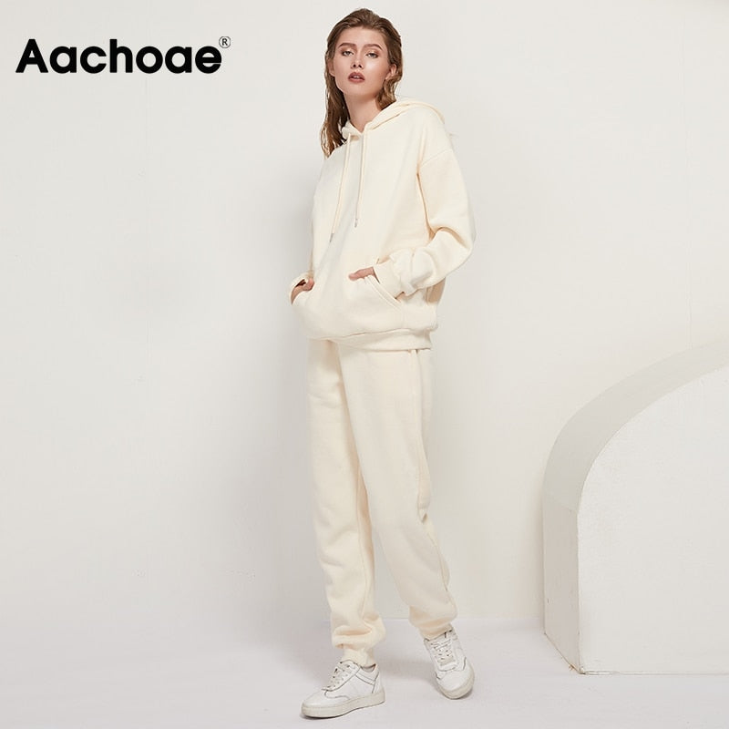 Aachoae 2021 Solid 100% Cotton Suits Women Set Fleece Pullover Hooded Hoodies Sweatshirts Casual Pants Tracksuit Plus Size