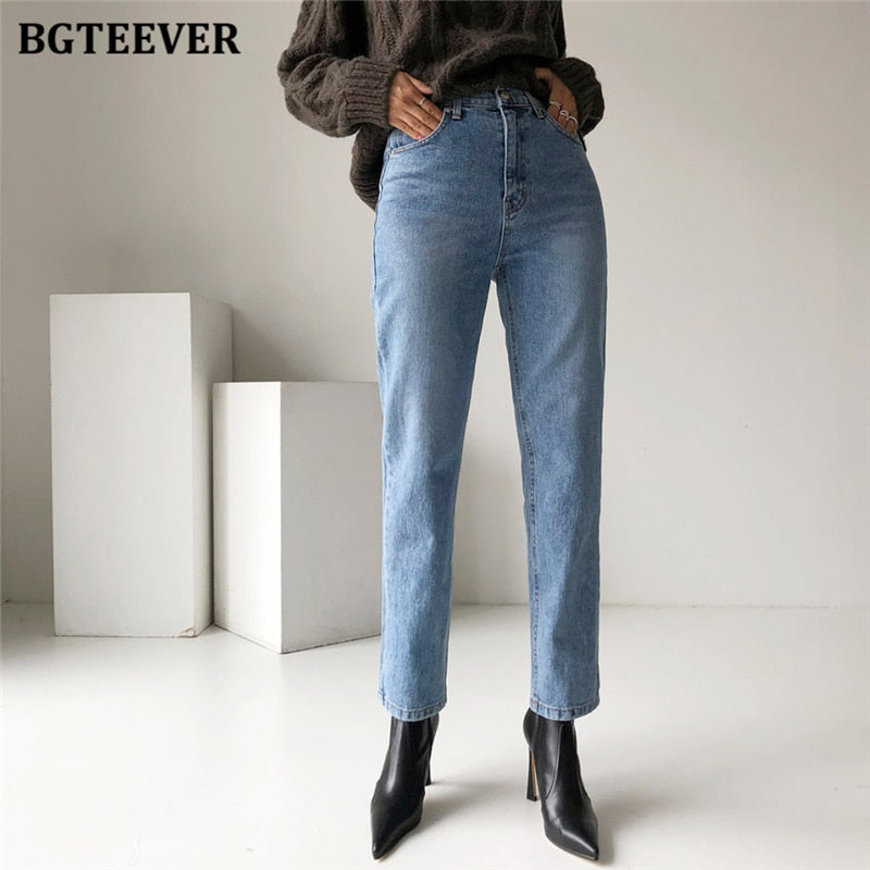 BGTEEVER Vintage Streetwear Women Denim Blue Jeans Autumn Winter High Waist Loose Trousers Female Straight Leg Jeans Pants
