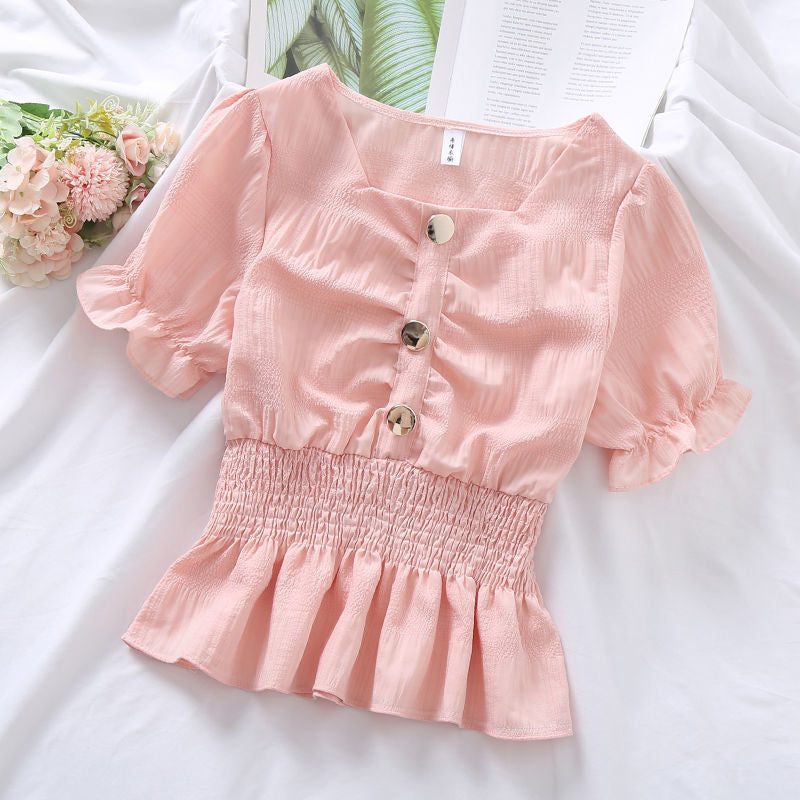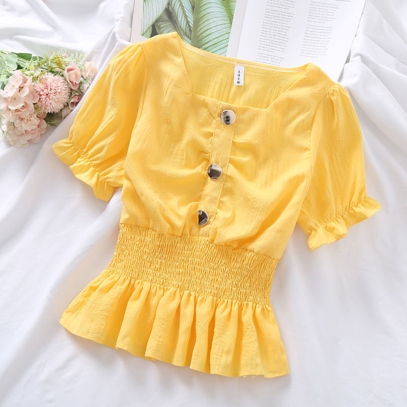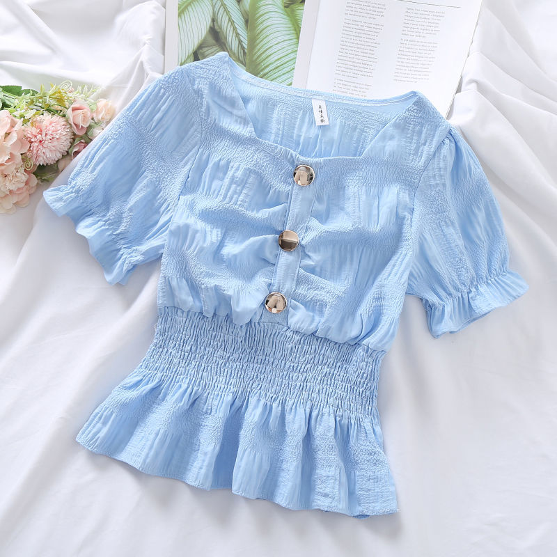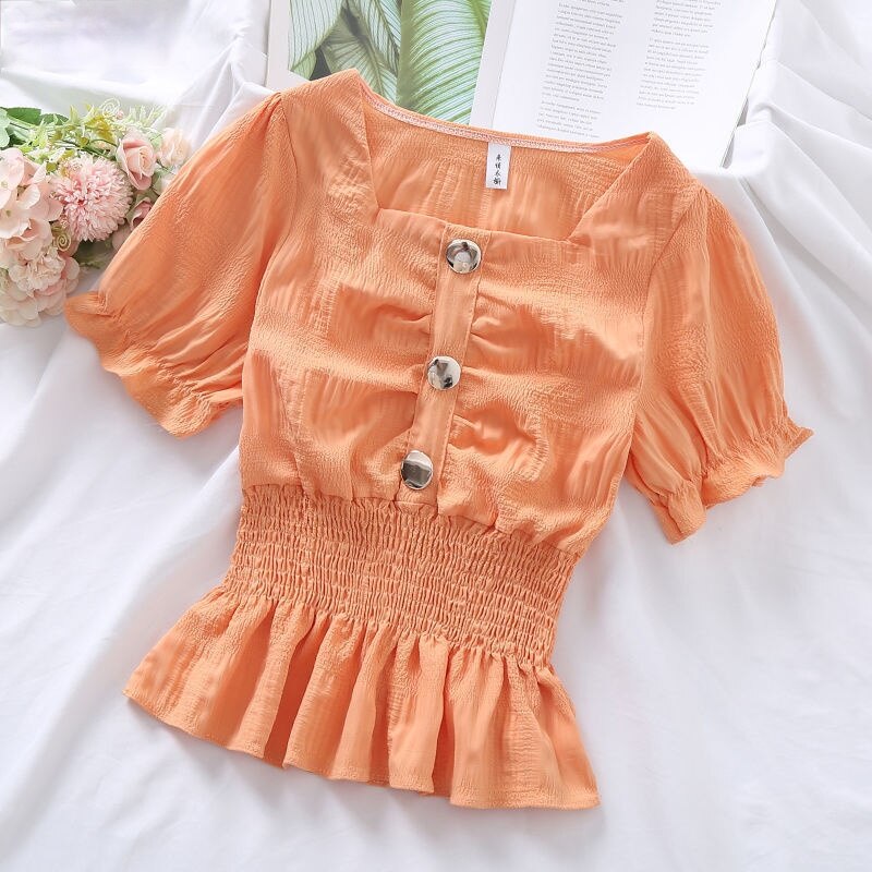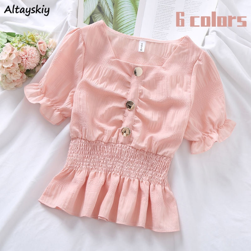 Blouses Women Candy Colors Ulzzang Kawaii Fashion Ins Preppy Clothing Summer Sweet Lovely Girls Slim 2021 Shirring Square Collar
