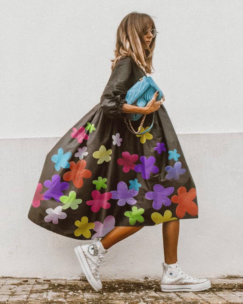 Bohemian Beach Dress 2021 Summer Rose Leaf Print Three-Quarter Sleeves Large Mid-Length Dress 112