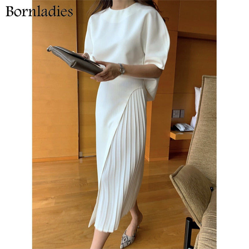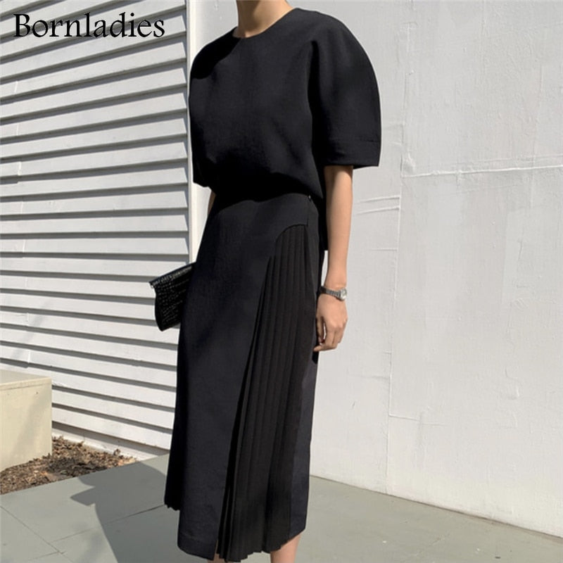 Bornladies Skirt Suits Women Summer Two Piece Set Short Sleeve O-neck T Shirt + High Waist Long Pleated Skirt 2 Piece Outfits