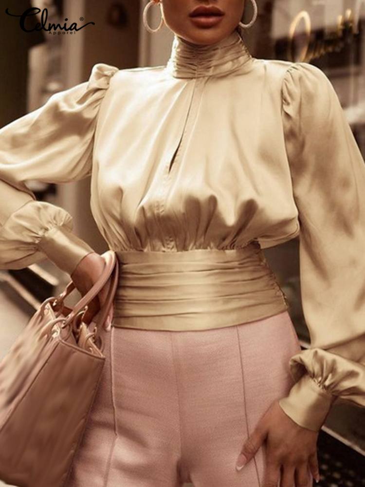 Celmia Pleated Waisted Long Puff Sleeve Tops Street Elegant Satin Fashion Short Tunic High Collar Hollow Out Chest Women Blouses