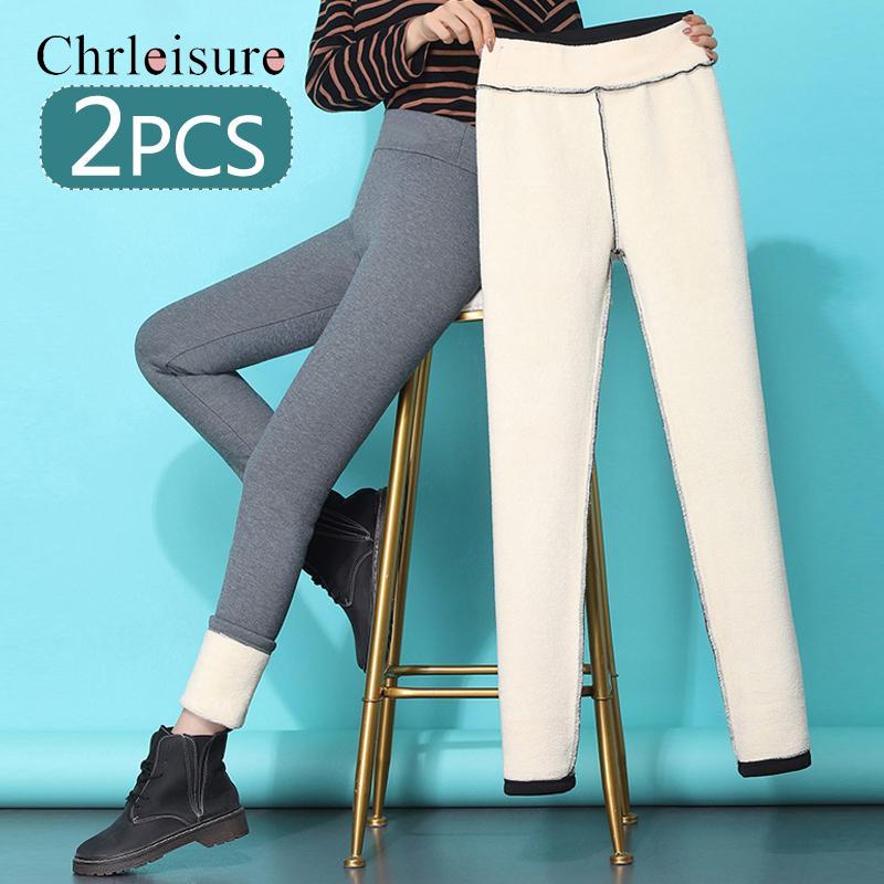 CHRLEISURE Winter Warm Pants Women 2 Pcs Velvet Thick Legging High Waist Push Up Elastic Sports Pants Warmth Lamb Wool Pants