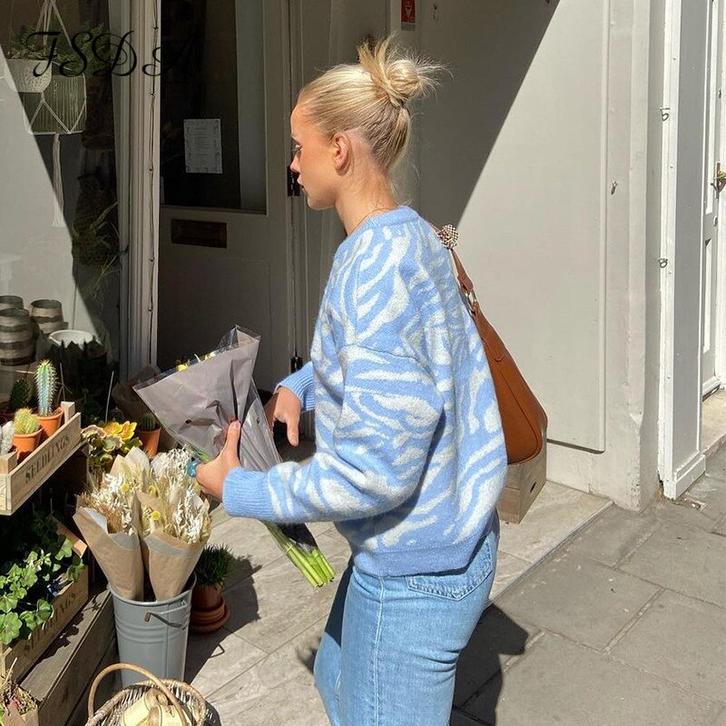 FSDA 2021 Autumn Winter Blue Casual Sweater Top O Neck Long Sleeve Oversized Knitted Pullover Loose Fashion Jumper