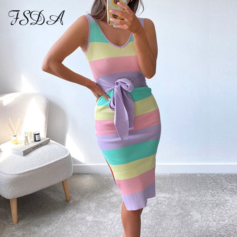 FSDA 2021 Summer Stripe Knitted Bodycon Dress Midi Women Blue Sexy V Neck Elegant Bandage Casual Sleeveless Party Dresses