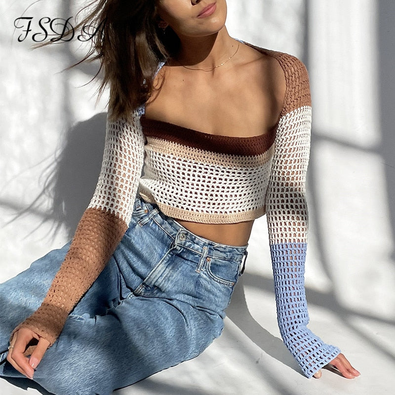 FSDA Knitted Long Sleeve Crop Top Women Beach Autumn Summer Patchwork Vintage Green Casual T Shirts Sexy Fashion