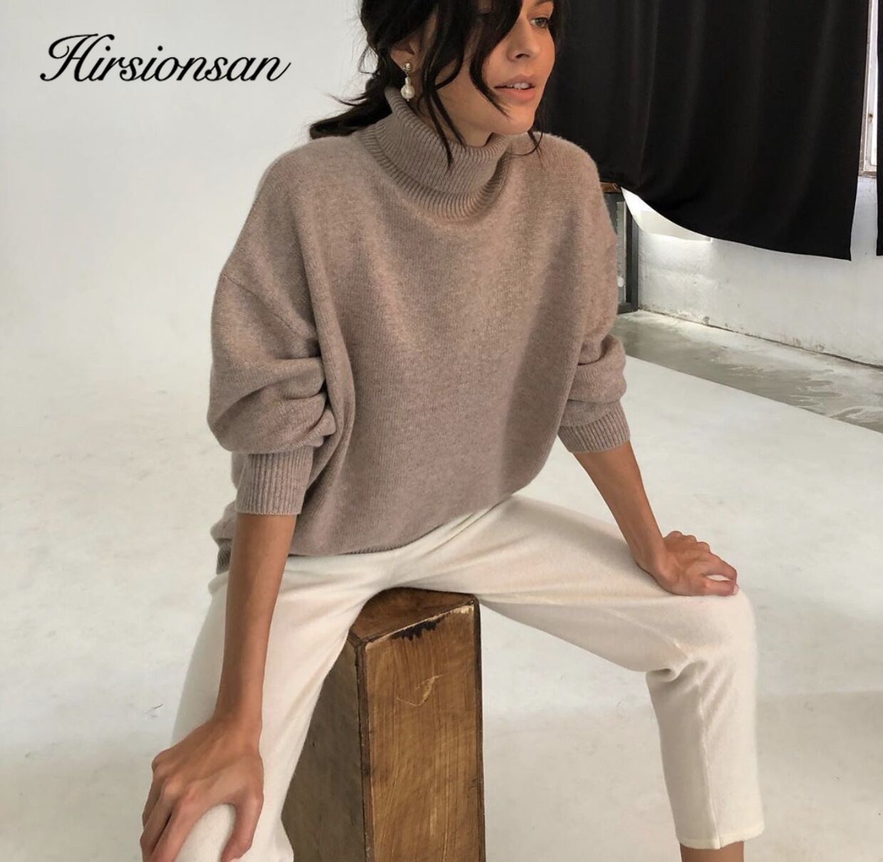 Hirsionsan turtle Neck Solid Cashmere Sweater Women Elegant Soft Warm Female Knitted Pullovers Basic Loose female Jumper