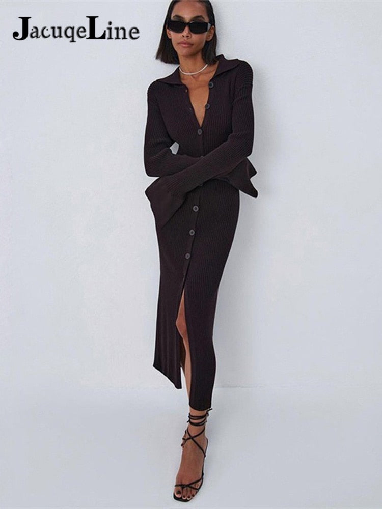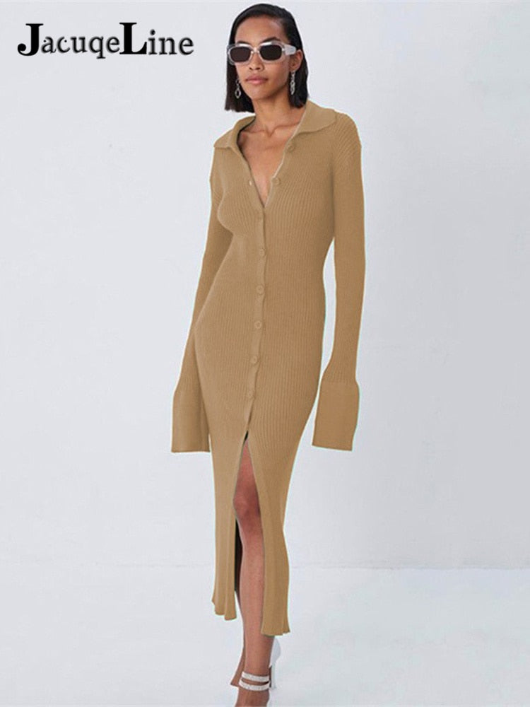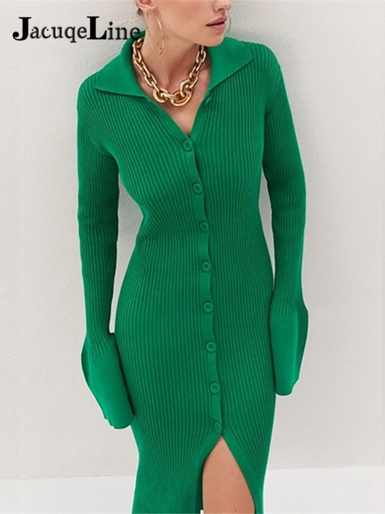 JacuqeLine Winter 2021 Green Evening Party Christmas Dresses For Women Clothing Knitted Sweater Split Sexy Bodycon Maxi Dress