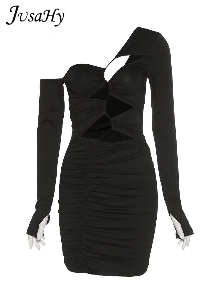 JuSaHy Sexy Black Hollow Out Pleat Mini Dress for Women Fashion Long Sleeves Stretchy Slim Dress Midnight Party Clubwear Hot