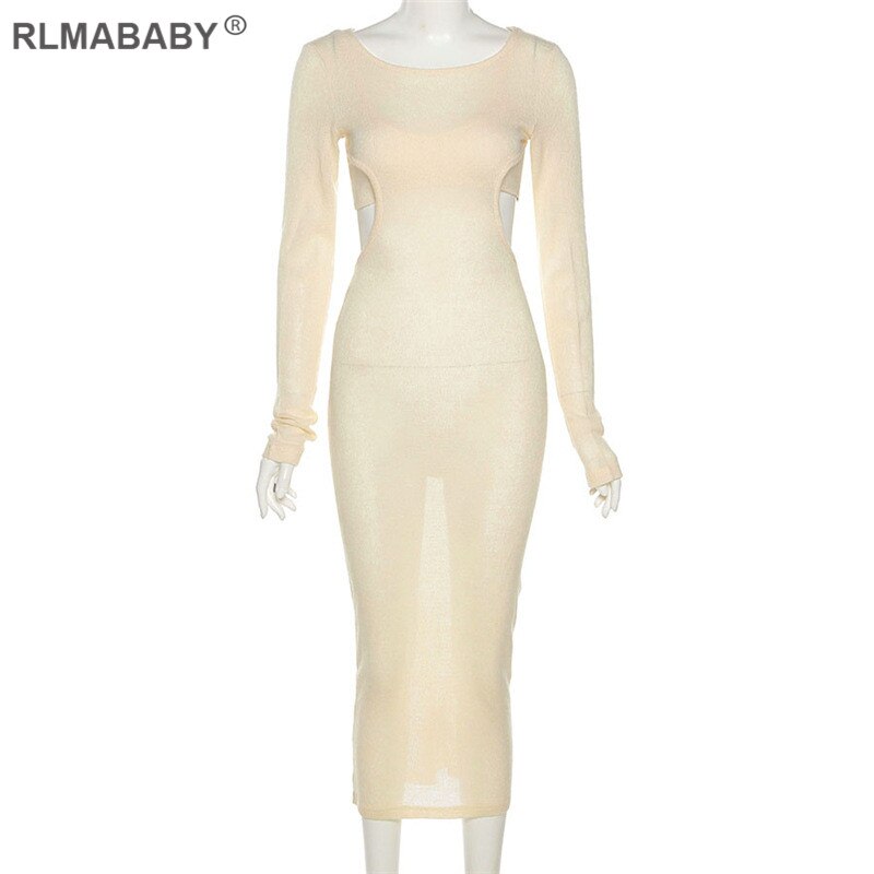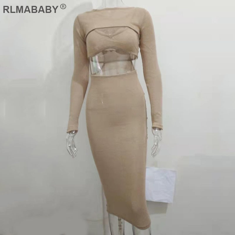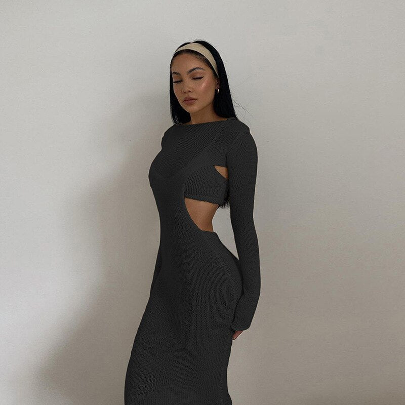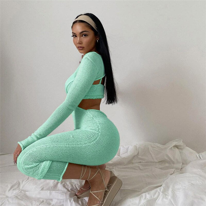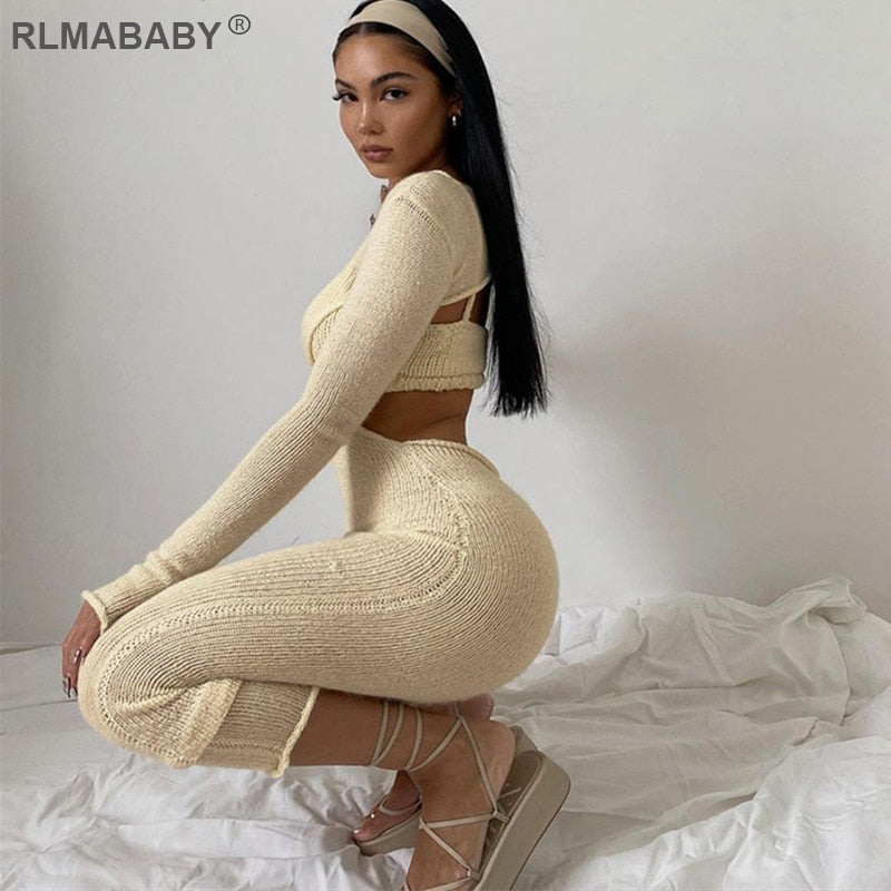 Knitted Sweater 2 Piece Set Suit Women Sexy Bacless Long Sleeve Maxi Bodycon Dress And Spaghetti Strap Cropped Top Outfits Set