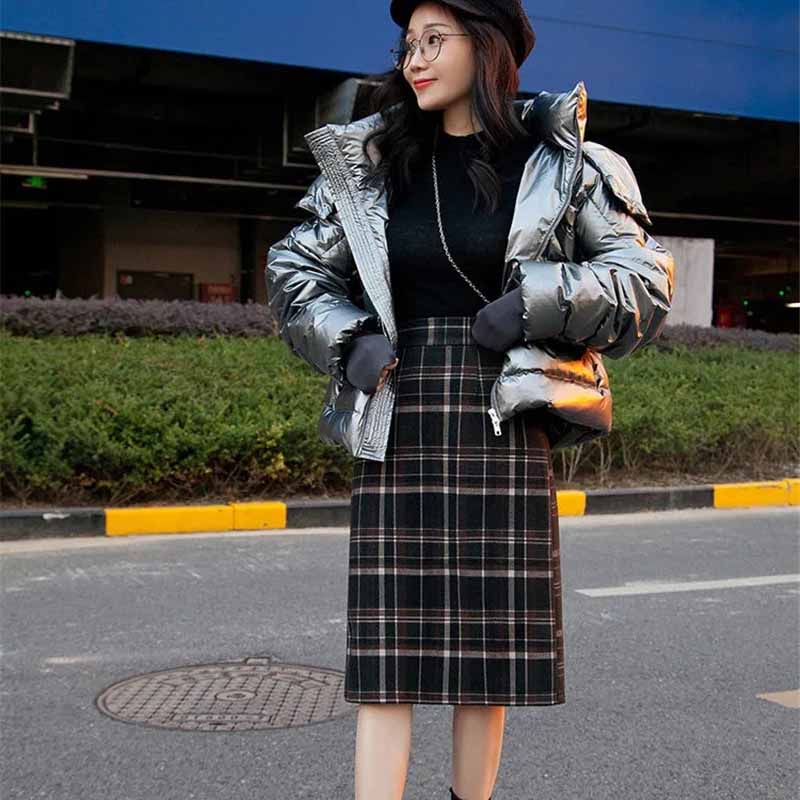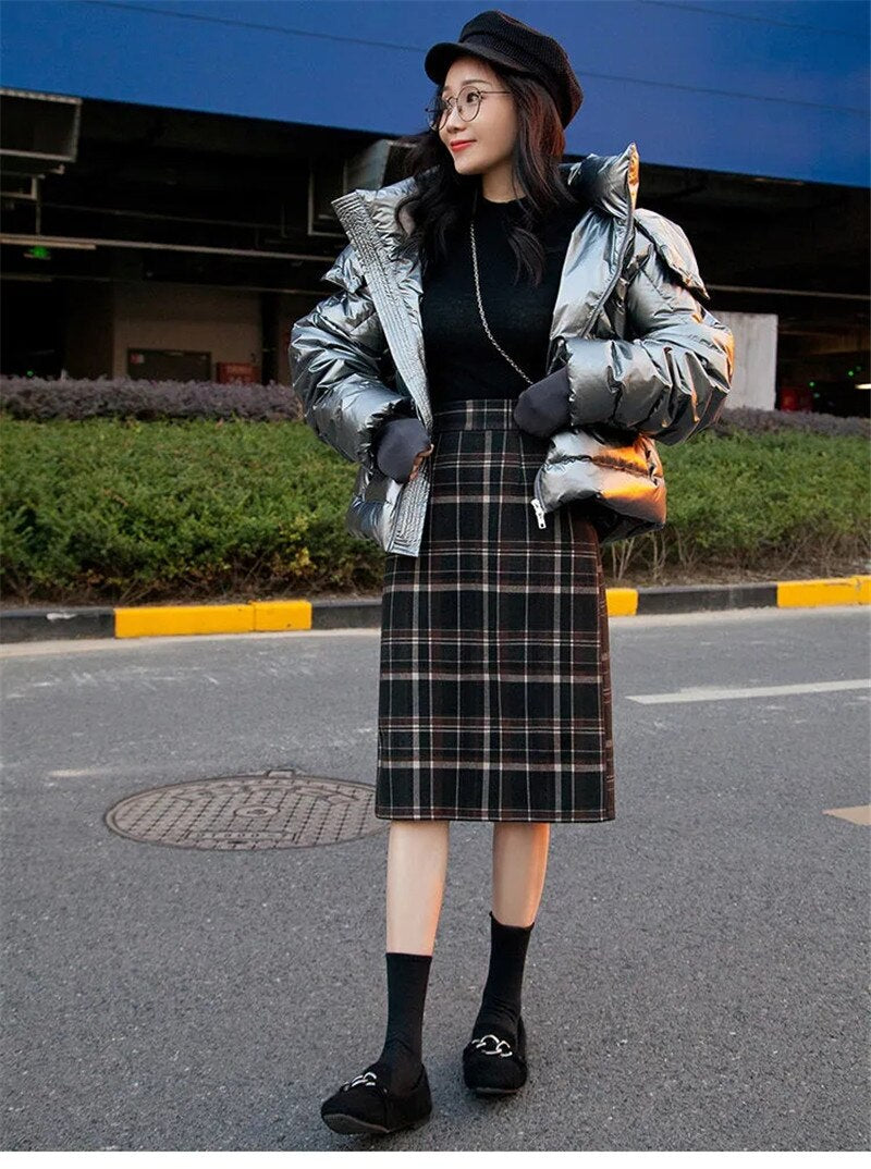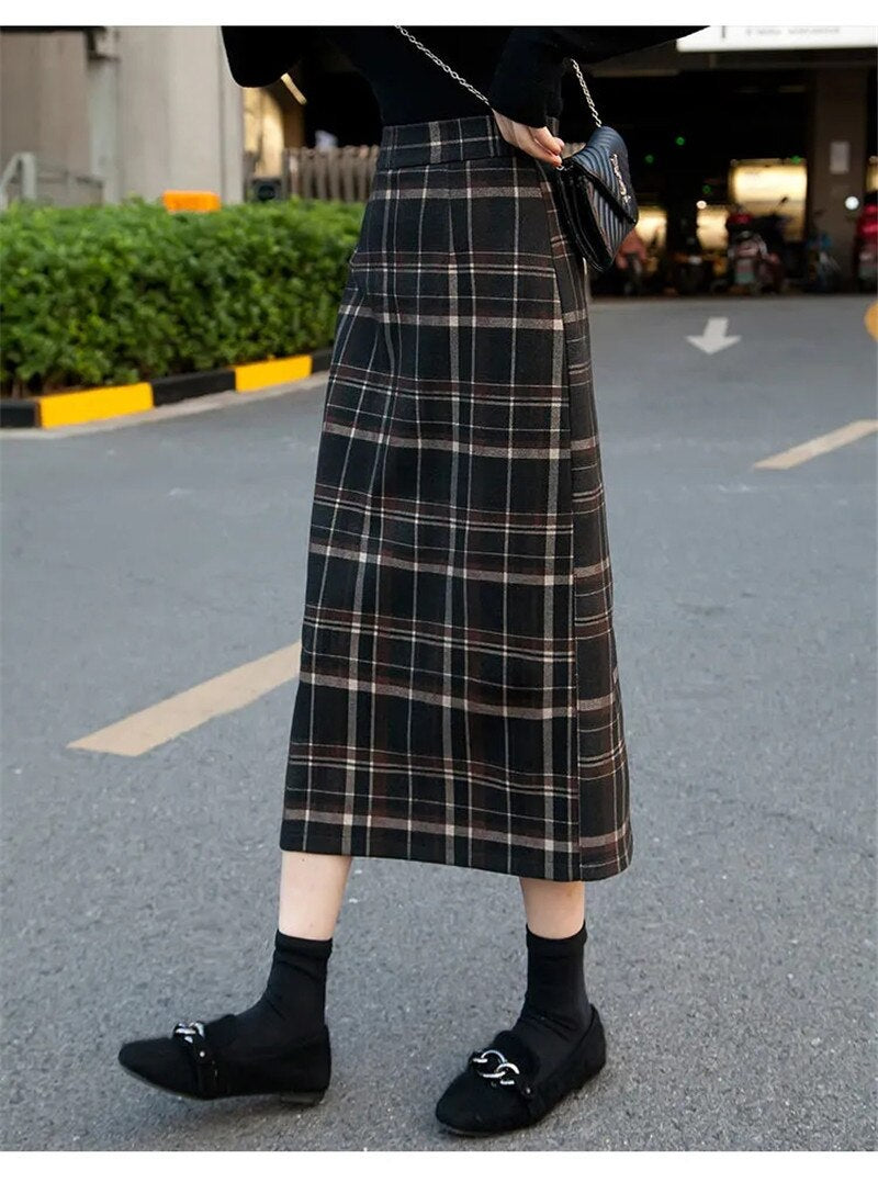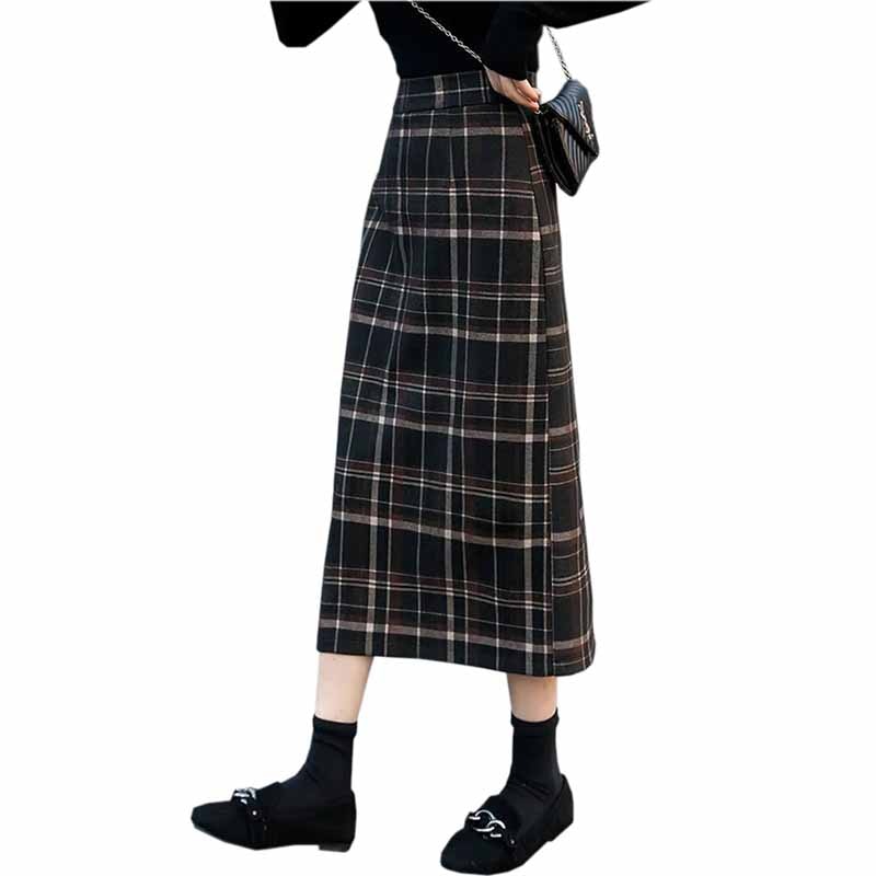 NEW 2020 Real Shot Woolen Cloth Plaid Skirt Women Autumn Winter Vintage High Waist Hem Split Slim Long Package Hip Skirts KW334