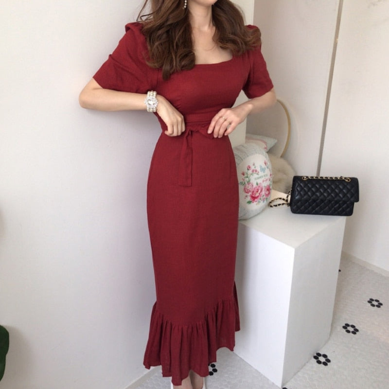 New 2021 Women Spring Summer Square Collar Dress Cotton Linen Elegant Lace Up Dresses