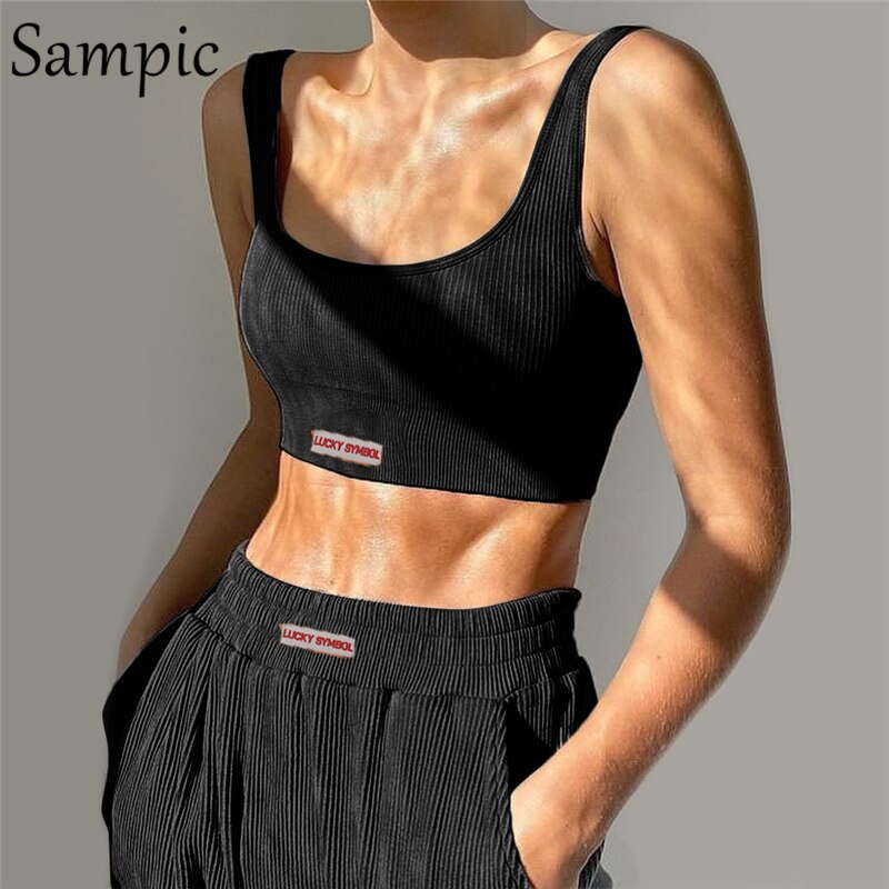 Sampic 2021 Summer Knitted Women Tracksuit Skinny Two Piece Set Print Letter White Tops And Long Joggers Pants Suit 2 Piece Set