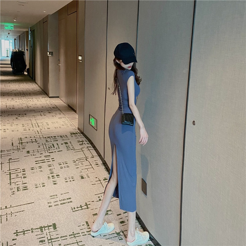 Summer Short Sleeve O-Neck Stretchy Split Dress Women Solid Casual Elegant Robe Bodycon Maxi Vestidos