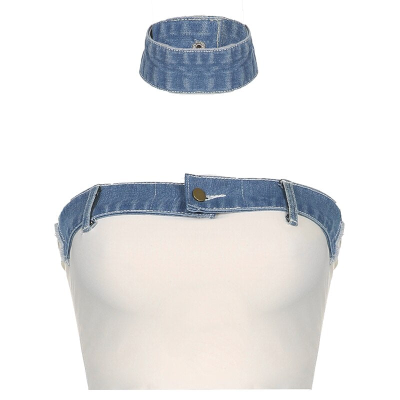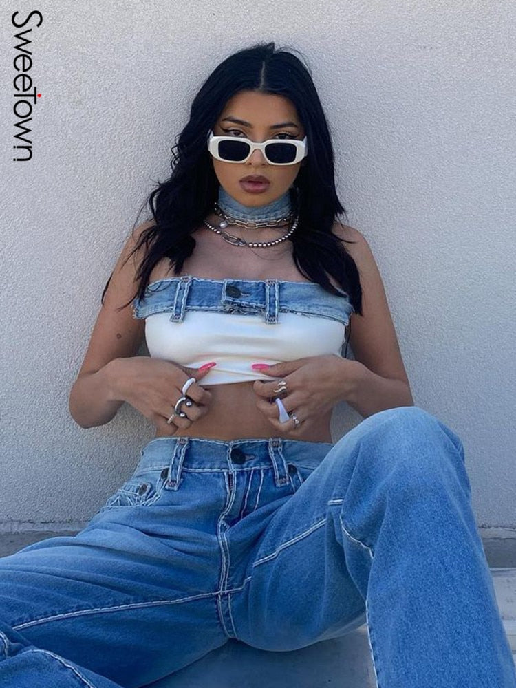 Sweetown Contrast Patchwork Choker Denim Tube Top Off Shoulder Strapless Slim Crop Tops Cool Cow Girl Summer Streetwear Vest