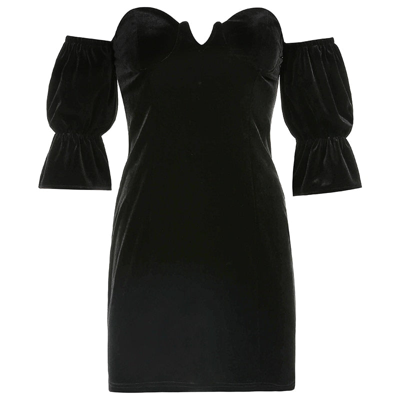 Sweetown Dark Academia Velvet Goth Dress Women Puff Sleeve Ruffles Girl Gothic Clothes Slash Neck Sexy Bodycon Mini Dresses