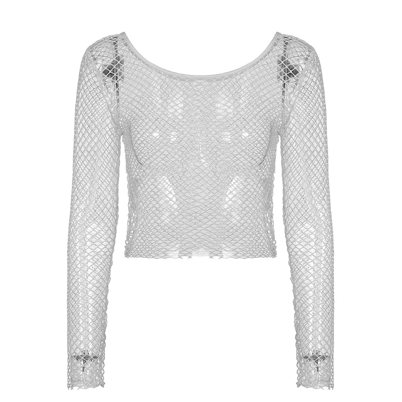 Sweetown Hollow Out See Through Sexy Slash Neck Fishnet Mesh T-Shirts Women Cute Club Outfits Off Shoulder Long Sleeve Crop Tees