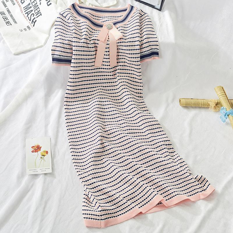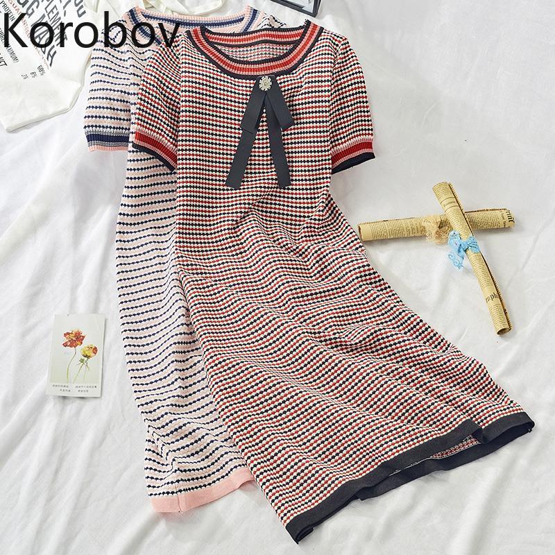 Toloer 2020 Summer New Preppy Style Striped Dress Vintage O Neck Bow Short Sleeve Dresses Korean Japanese Style Vestidos