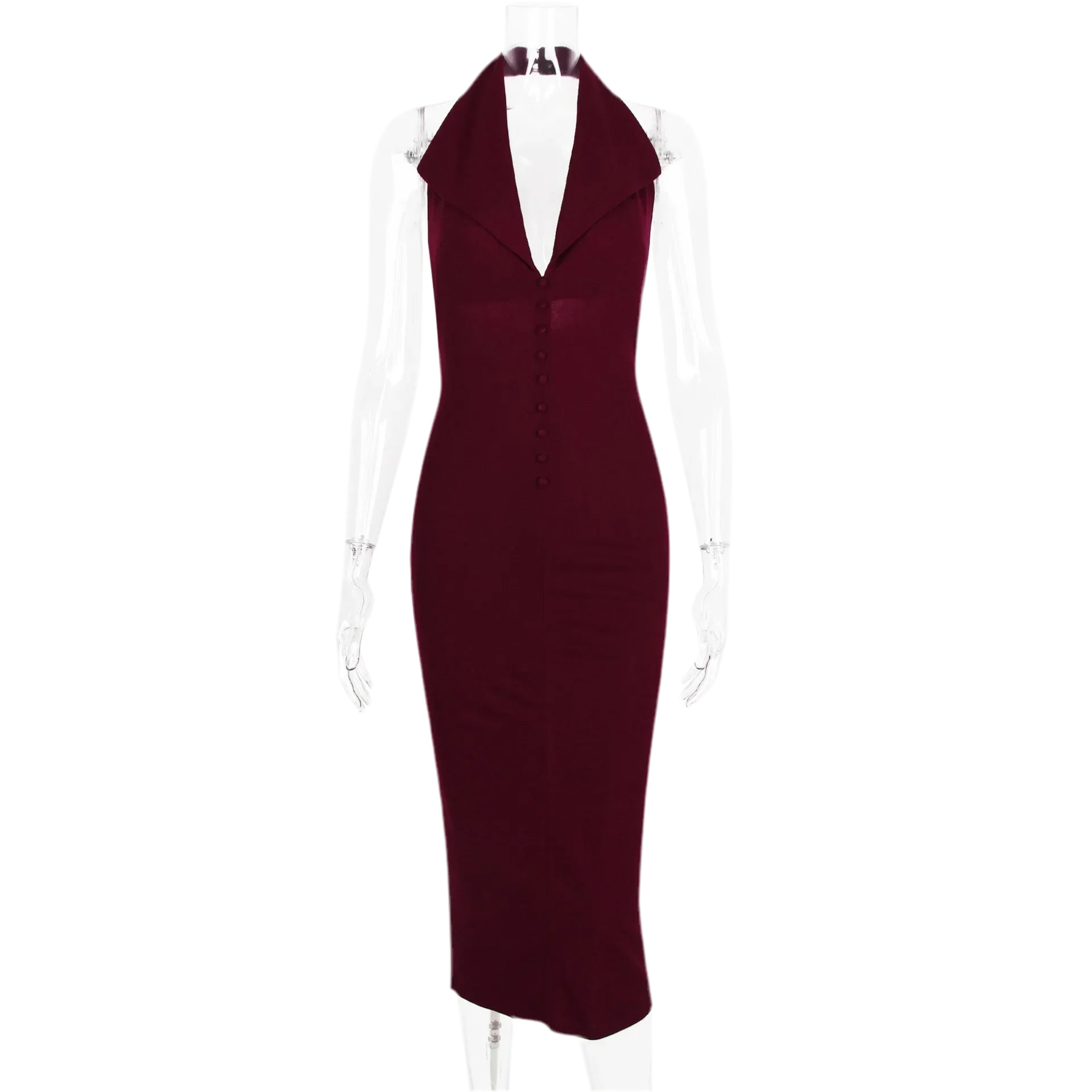 Toloer Burgundy Large Collar Halter Midi Dress-Outfit Ideas