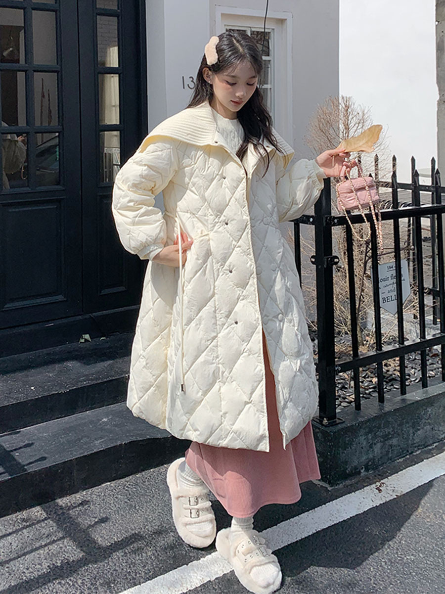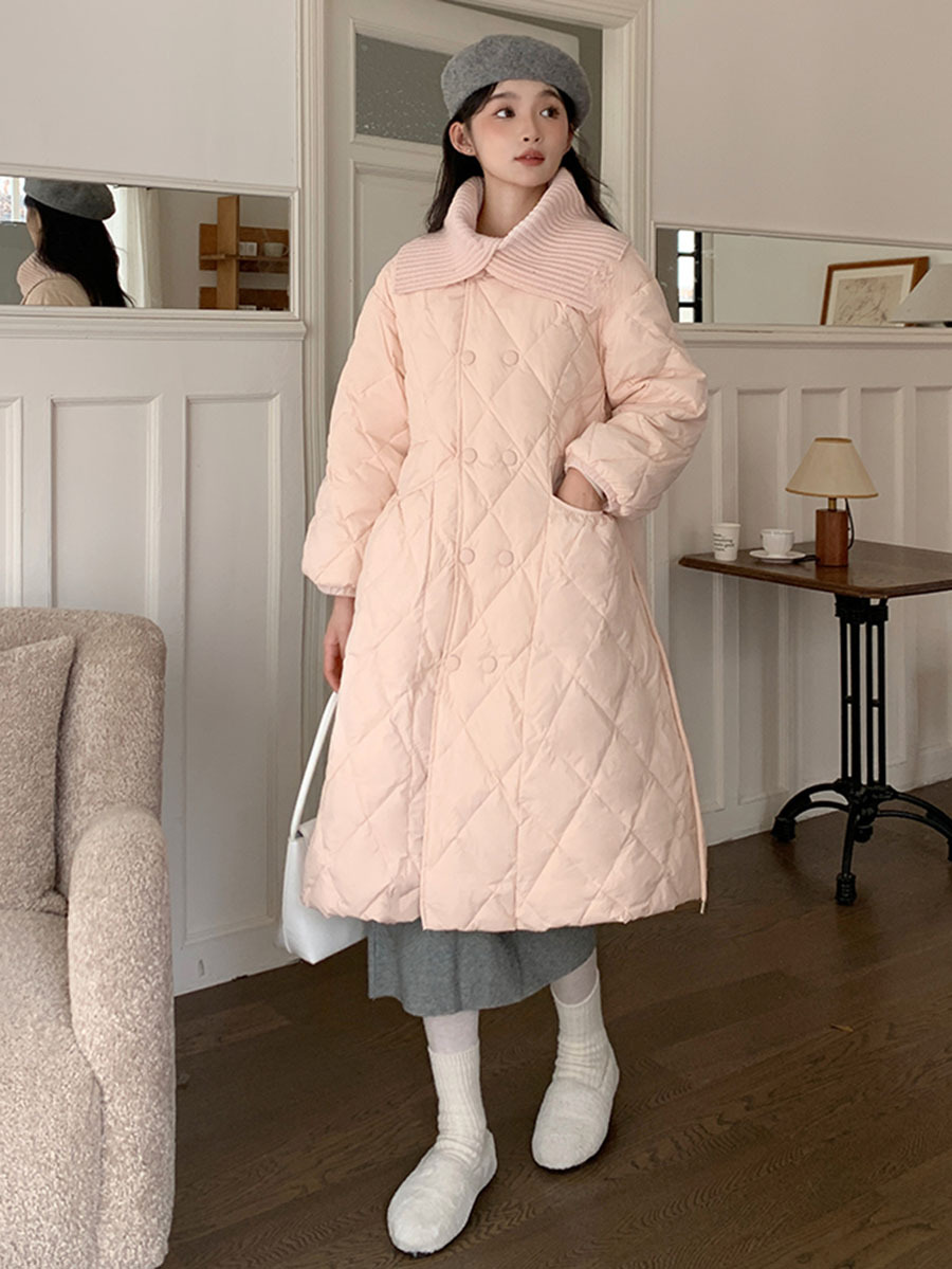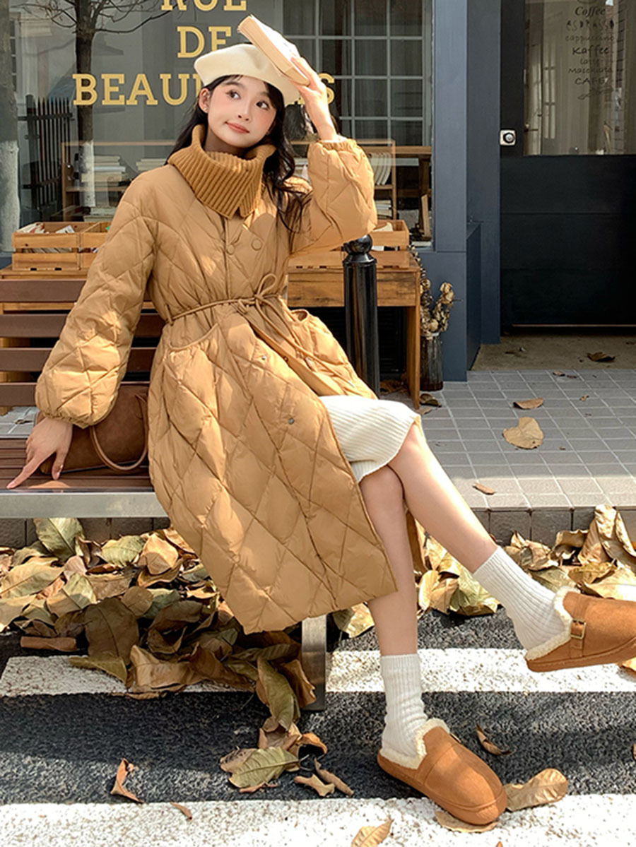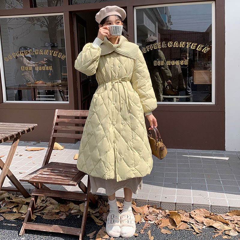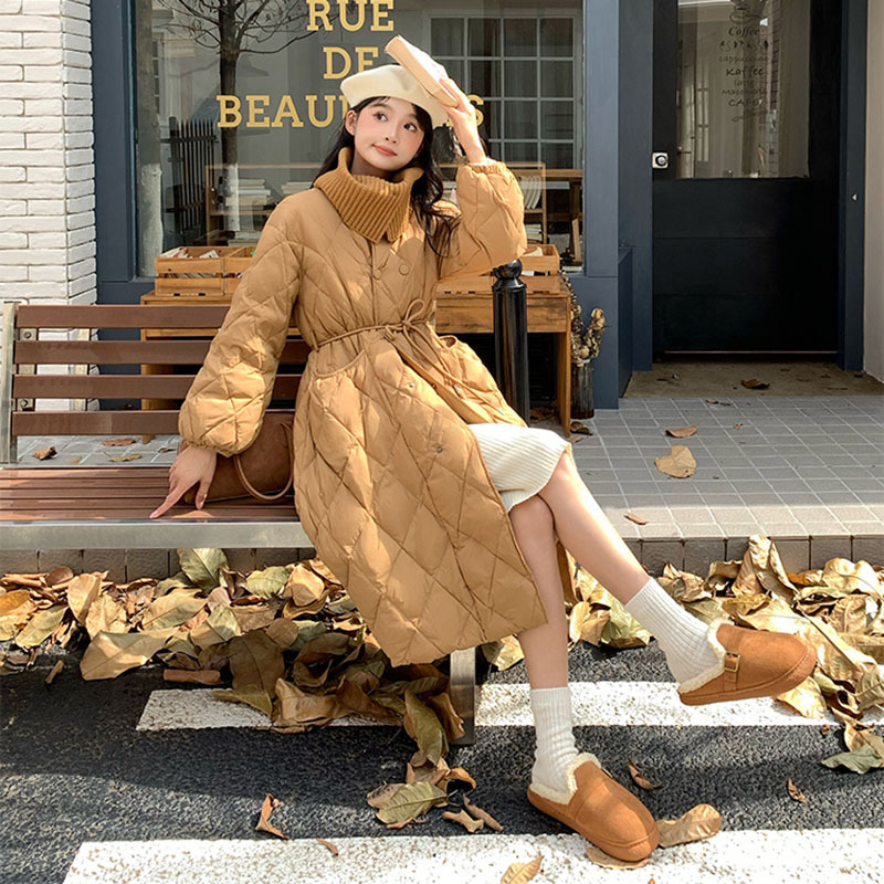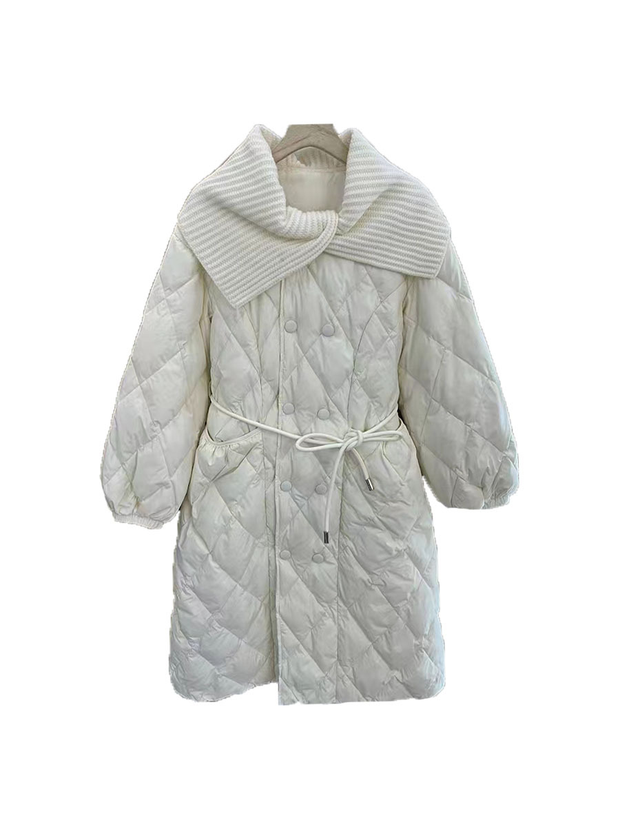 Toloer Ling Ge Knitting Collar Long Down Jacket Female 2024 Winter Fashion Thick Thin Belt Waist Show Thin Over The Knee Coat Tide-Outfit Ideas