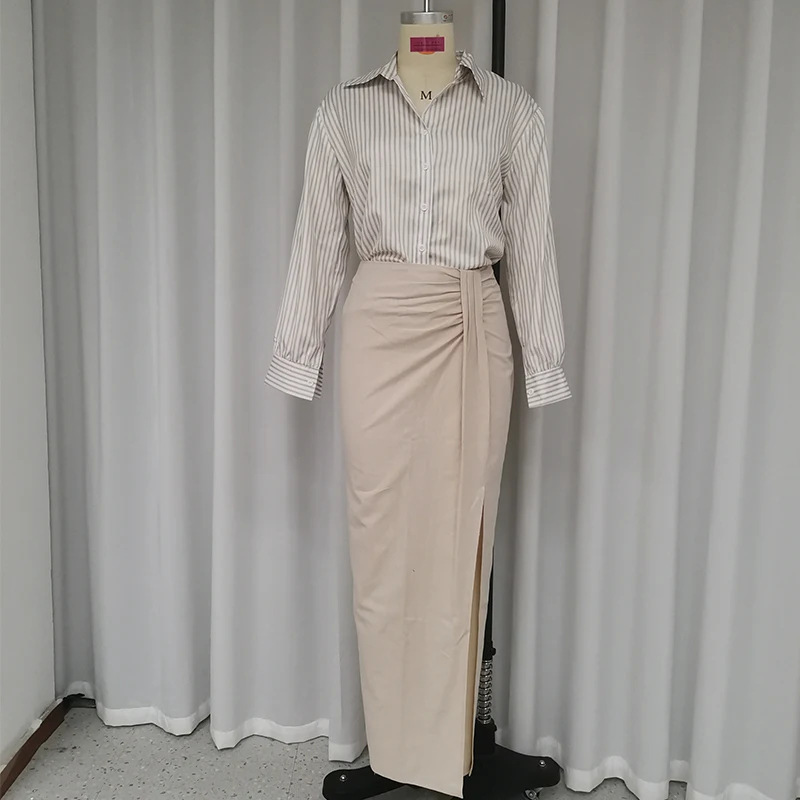 Toloer Toloer 2024 New Fashion Low-Cut Striped Shirt High-Waisted Slit Skirt Suit-Outfit Ideas