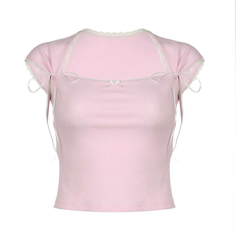 Toloer Toloer Girly Lace Lace Pink Short-Sleeved T-Shirt Square Bow Slim Slim Top-Outfit Ideas
