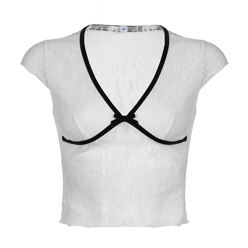 Toloer Toloer Pure Desire Lace Bow Splicing Color T-Shirt V Collar Slim Micro Revealed Umbilical Jacket-Outfit Ideas