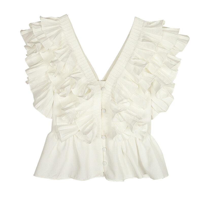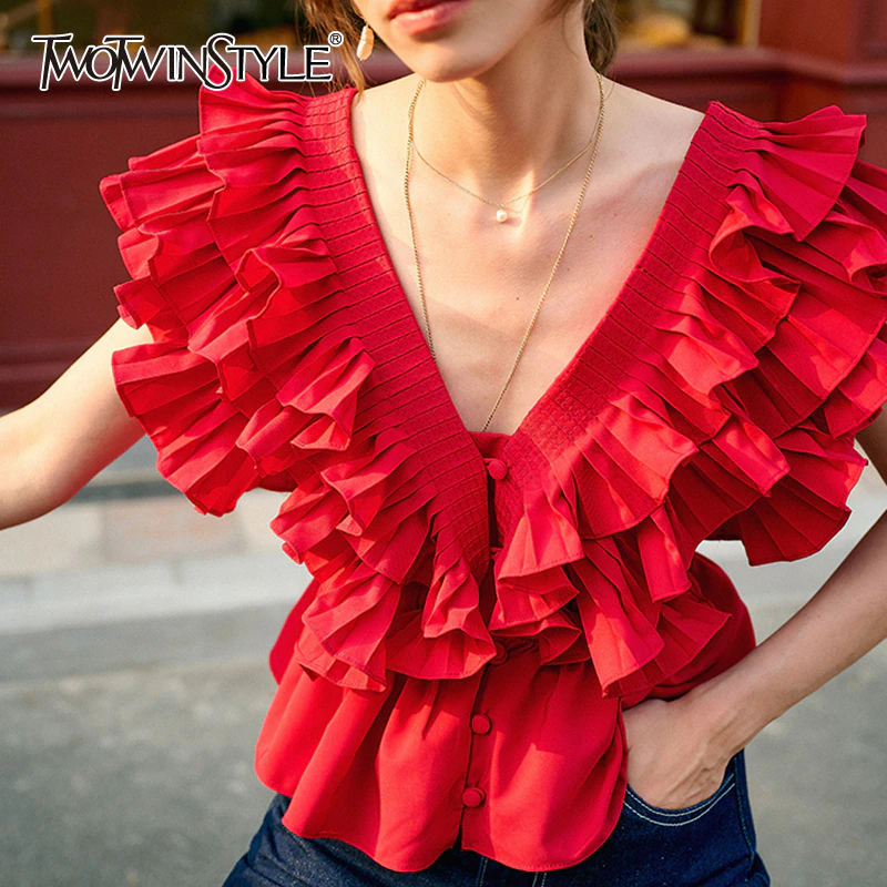 Toloer Toloer Red Casual Patchwork Ruffle Shirts For Women V Neck Short Sleeve Ruched Slim Blouses Female 2023 Summer Fashion New 1127-0-Outfit Ideas