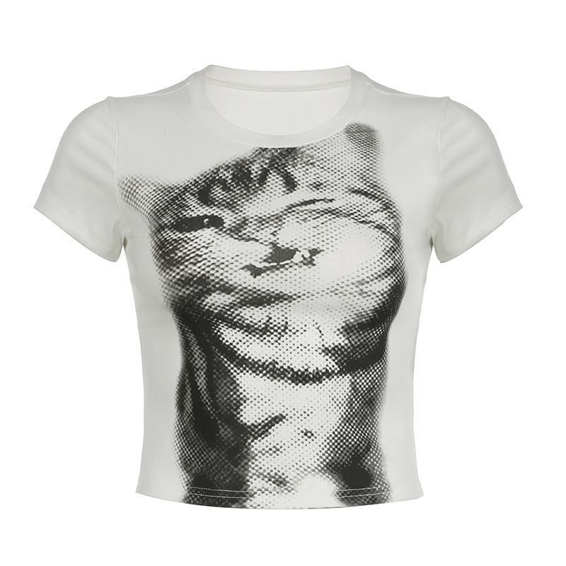 Toloer Toloer Style Cat Print Short-Sleeved T-Shirt Women's New Round Collar Retro Basic Versatile Slim Top-Outfit Ideas