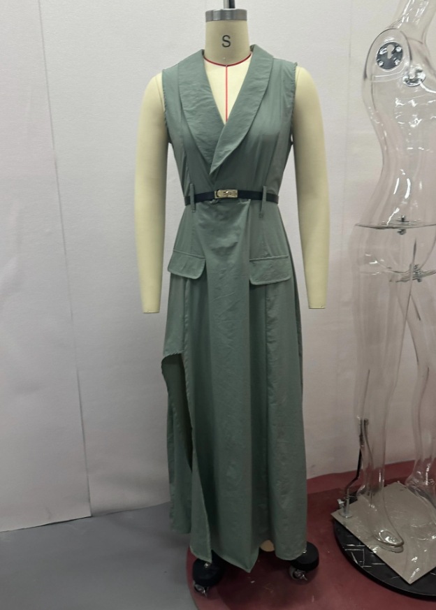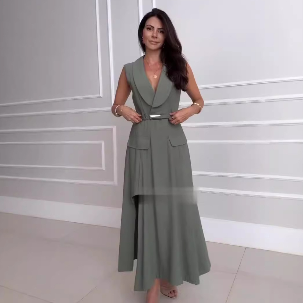 Toloer Toloer Summer Women's Solid Color Lapel Tie Waist Sleeveless Temperament Dress-Outfit Ideas