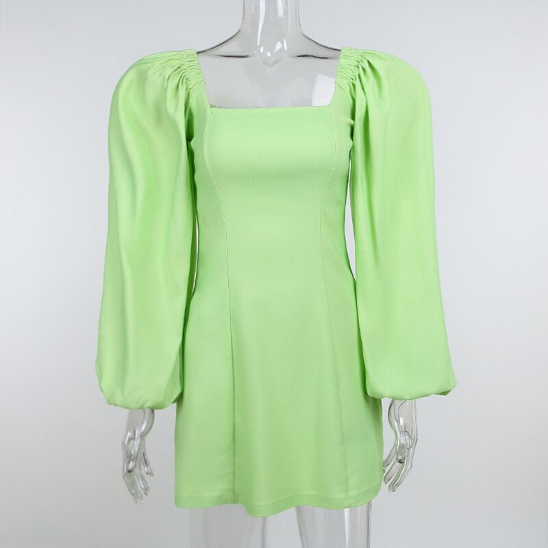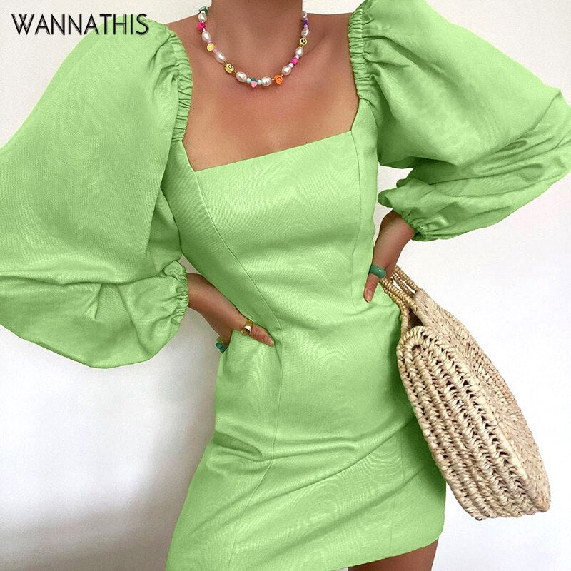 WannaThis Women Puff Sleeve Mini Dress Sexy Casual Square Collar Autumn 2021 Vintage Green Clubwear Party Elegant Female Vestido